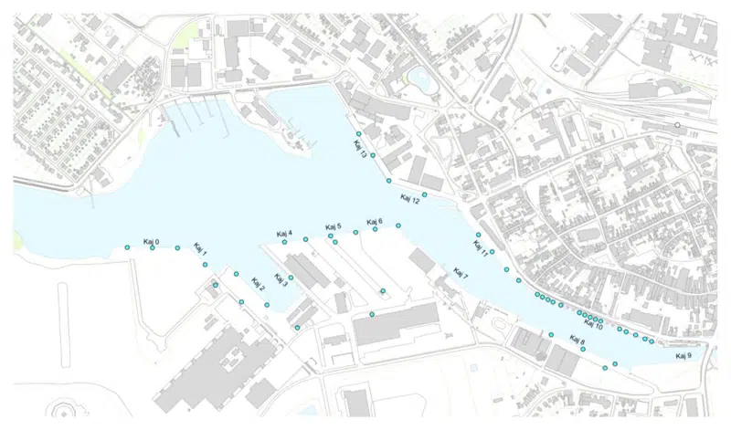 Herunder er tabeller og kort over havnens kajer og hvorledes de er udstyret