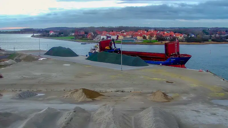 Det første, der blev udskibet fra kajen, var en kornlast. Men som forventet er det især Femern-aktiviteter, der er rykket ind på den gode brede kaj. Skib efter skib ankommer nu med skærver, der losses direkte til bil, eller kortvarigt bliver lagt på kaj og siden kørt væk med lastbil.
