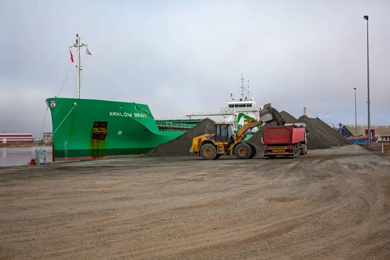 Skærverne bliver sejlet hertil fra Norge. Nogle af skibene er selvlossere, mens andre skal have havnekran til losning. Skibslasterne varierer lidt, men den typiske størrelsesorden er på 4.000 tons og derover. Skærverne bliver lagt i store bunker på kaj for hen over de næste dage at blive læsset på lastbil og kørt til Femern-byggeriet.