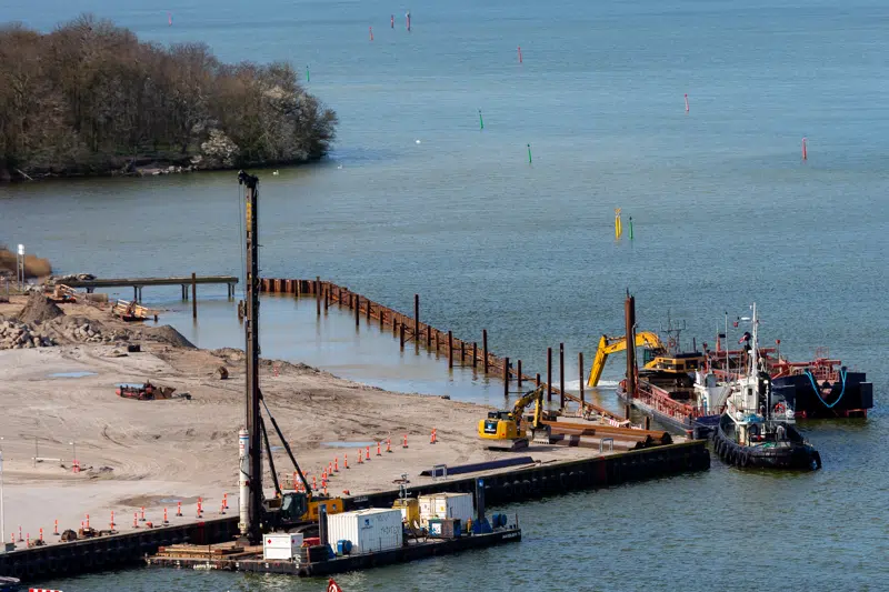 Arbejdet med etablering af ny kaj ved indsejlingen til havnen er langt fremme.