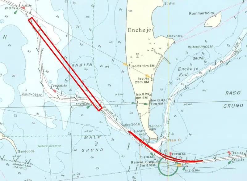 Første etape skal udrette indsejlingen. For at udrette den eksisterende sejlrende lokalt skal der bortgraves materiale på en strækning af ca. 1.450 m vest for Enehøje samt ske en udvidelse i svinget syd for Enehøje. Omlægningen af sejlrenden vil forbedre sejladssikkerheden i sejlrenden betydeligt ved at eliminere et skarpt sving og ved at give betydeligt blødere kurver i to andre sving. Med andre ord vil sejlrenden vest for Enehøje blive opgraderet således, at besejlingsforholdene er mindst lige så gode som i den del af sejlrenden, der ligger øst for Enehøje.