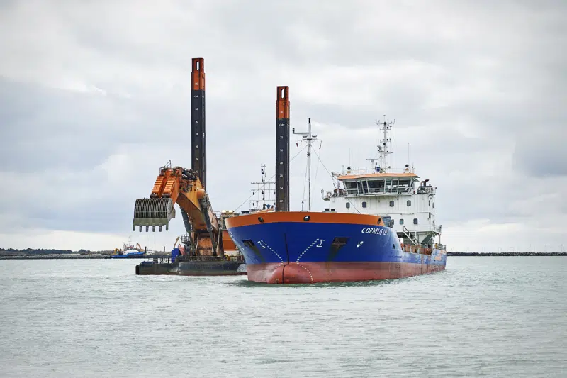 Fetsy og Manta graver på omkring 40 meters dybde, mens søstrene Simson og Goliath graver på omkring 20 meters dybde. Alt det materiale, de graver op, bliver læsset direkte på skibe, som sejler materialet ind til land. Her bliver det enten læsset på dumpere og kørt til en destination ved arbejdshavnen, eller det bliver læsset på pramme og transporteret til det nye strandområde på den vestlige side af Rødbyhavn. Der er 10 skibe tilknyttet projektet, og de sejler i pendulfart mellem udgravningsfartøjerne og land. De mange sten til digerne i projektet bliver importeret fra syv forskellige stenbrud i Norge. Herfra sejles de til Rødbyhavn og bliver fra transportskibene læsset på fladtoppede pramme. Hvorefter de bliver bugseret hen til digerne af slæbebåde. Der findes 13 forskellige fladtoppede pramme, der bliver bugseret rundt af 13 slæbebåde. Dog har slæbebådene også til opgave at flytte rundt på udgravningsfartøjerne, når disse ikke ligger fast med anker.