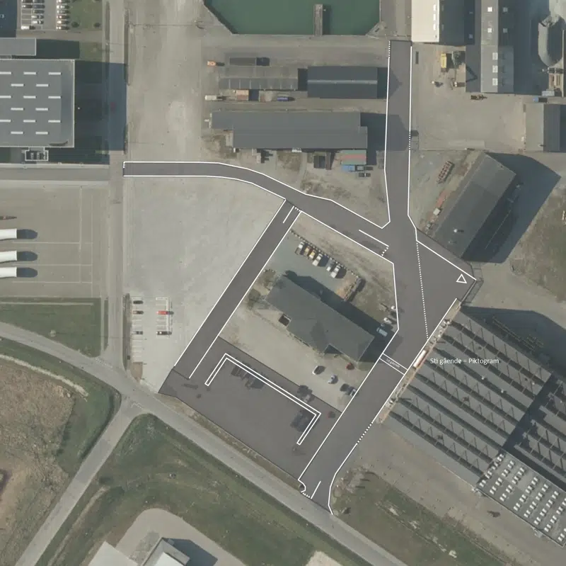 Asfaltbelægningen på tilkørselsveje er forstærket, og nu skal området opstribes.